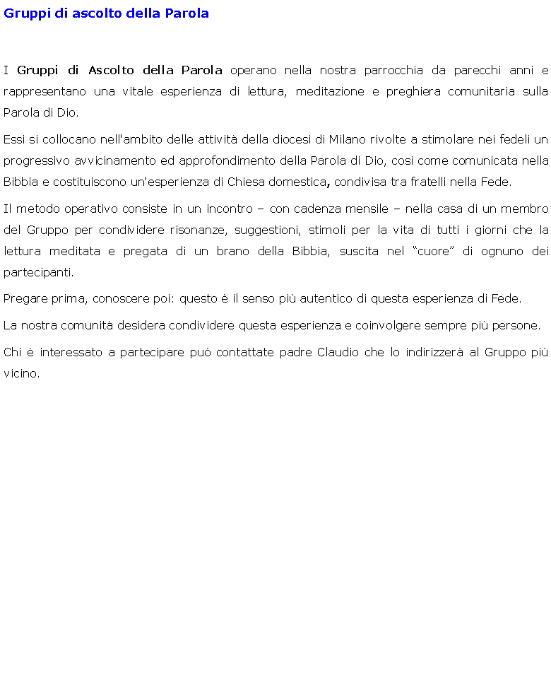 I Gruppi di Ascolto della Parola operano nella nostra parrocchia da parecchi anni e rappresentano una vitale esperienza di lettura, meditazione e preghiera comunitaria sulla Parola di Dio.